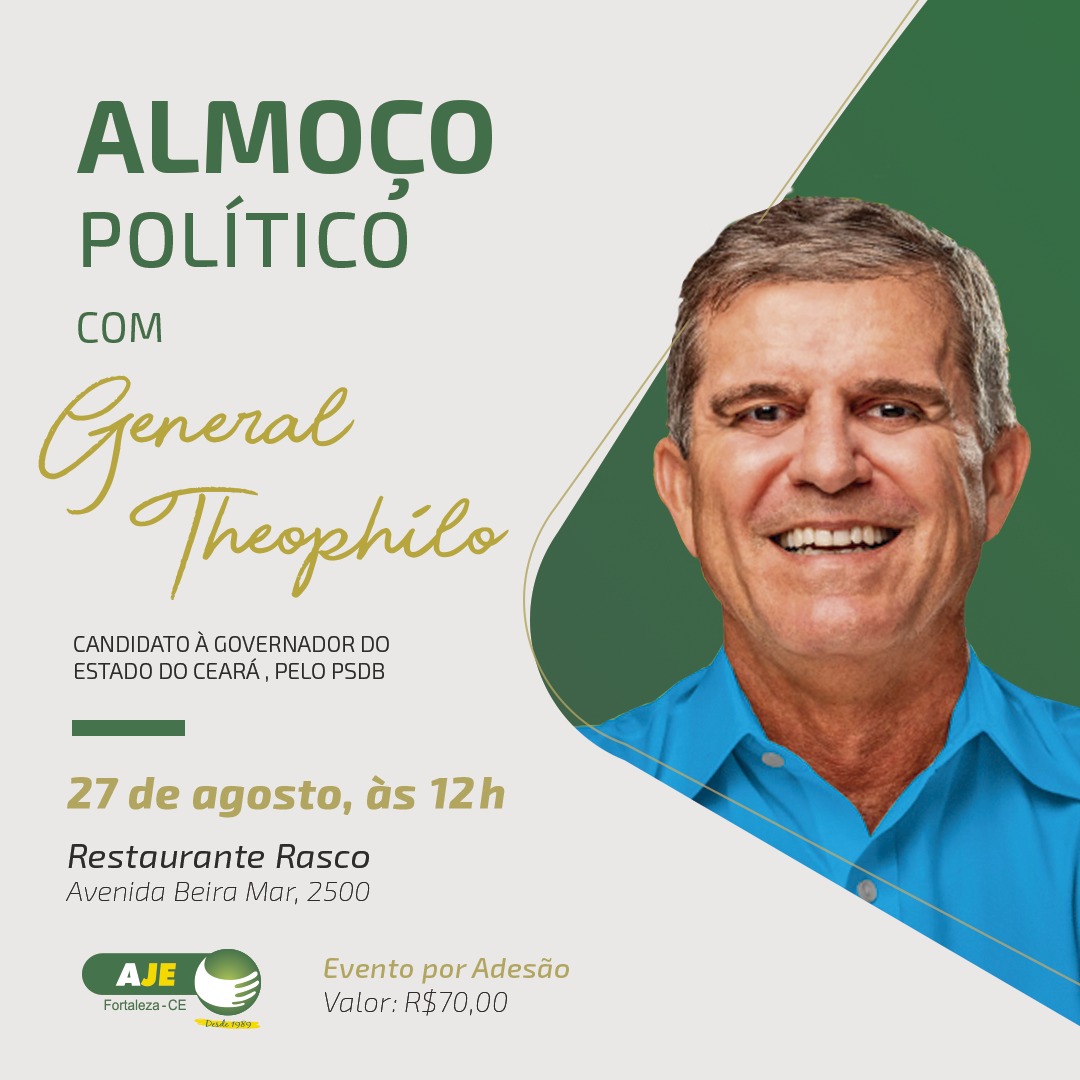 A AJE Fortaleza realizará na próxima segunda-feira, dia 27, seu primeiro Almoço Político de 2018, com o General Theophilo, candidato do PSDB ao Governo do Ceará, Na ocasião, ele vai expor seu plano de gestão e ouvir sugestões dos jovens empresários de Fortaleza.